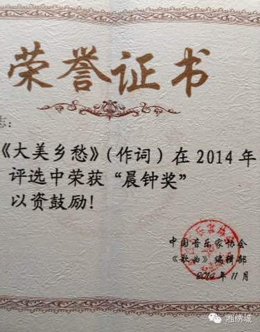 湖南湘绣城集团总经理曾应明新创的歌曲《大美乡愁》,夺得全国词曲新作“晨钟奖”。