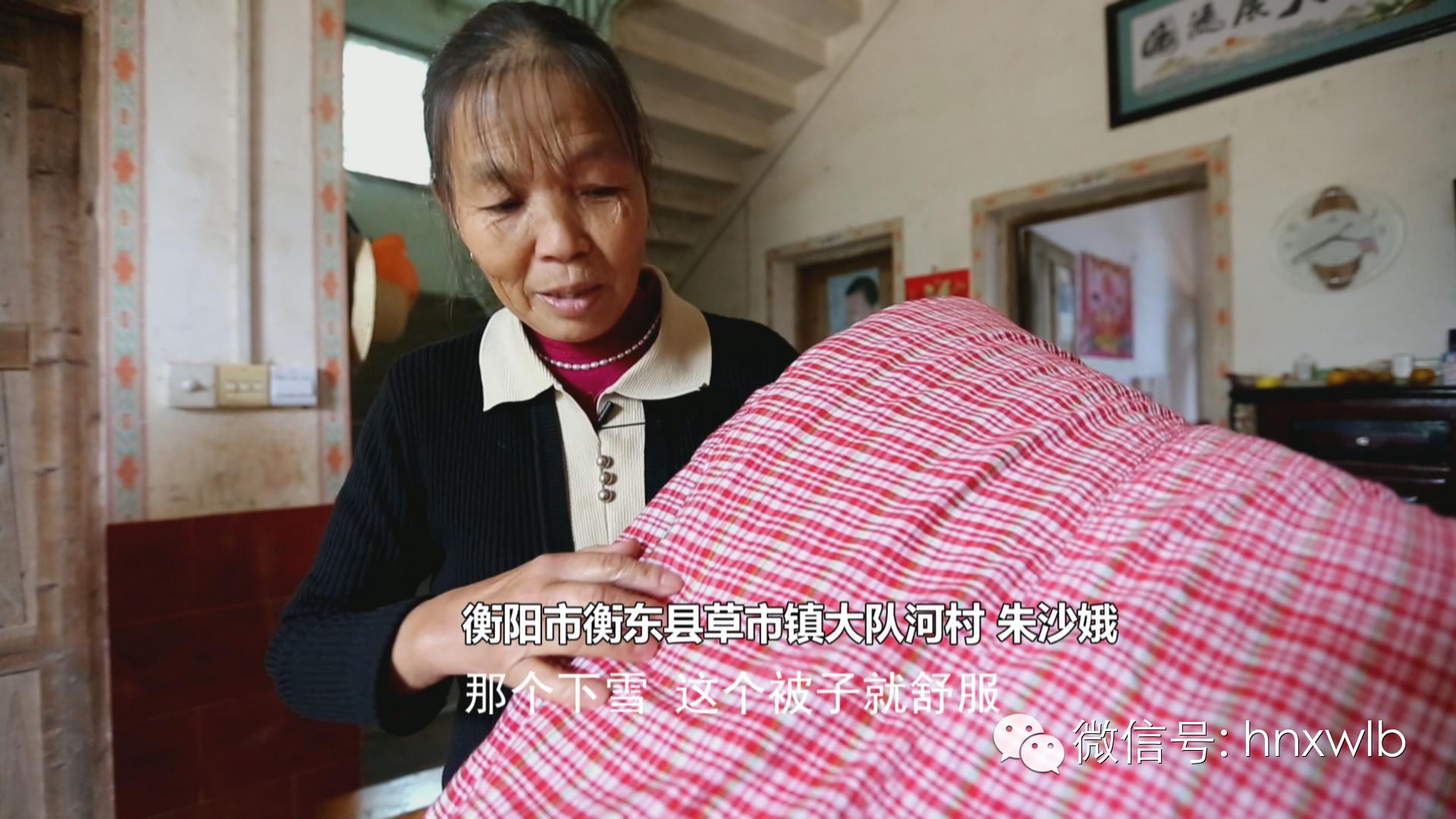 衡阳市衡东县草市镇大队河村 朱沙娥:这个被子,在下雪天,下雪,这个被子就舒服,暖和,暖和,好软,它过冬就好一些。