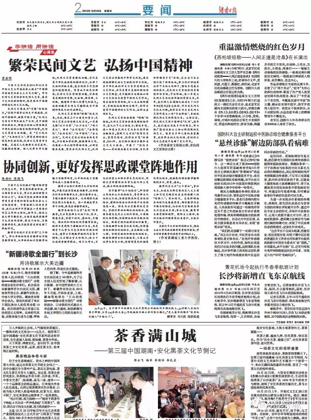 今天《湖南日报》要闻版头条、刊发湖南省文联副主席、省民协主席、湖南湘绣城总经理曾应明署名理论文章《繁荣民间文艺,弘扬中国精神》。该文也将成为引导湘绣城未来企业发展的工作依据,指导企业用湘绣艺术弘扬中国精神。